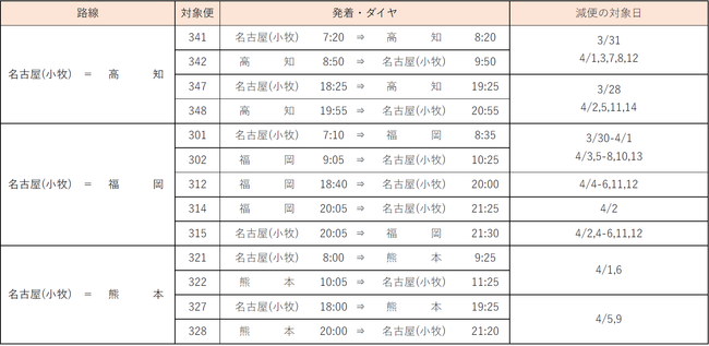 株式会社フジドリームエアラインズ(略称:FDA、本社:静岡県静岡市、代表取締役社長:楠瀬 俊一)は、新型コロナウイルス感染症の影響による航空需要の減少に伴い、3月27日(日)~4月15日(金)の期間、以下の路線での減便を決定いたしました。