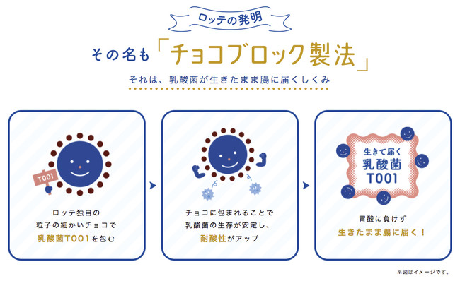 乳酸菌ショコラは、ロッテ独自の「チョコブロック製法」で乳酸菌T001を生きたまま腸に届けるチョコレートです。チョコレートで大切に包まれた乳酸菌T001は、チョコレートの中で安定的に生存し、胃酸にも負けず腸までとどきます。