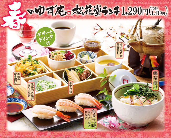 季節ごとに献立が変わるゆず庵人気のランチメニューです。春は、真鯛を使った「鯛茶漬け」をはじめ、旬な海老を贅沢に使ったお寿司「海老三昧(甘海老・赤海老・海老)」「牛すき筍」や愛知県産 あおさ海苔を使った「生あおさ海苔とろろ豆腐」が入った 松花堂ランチが新登場いたします。 デザート・ドリンク付きのセットは大人気な「いちご大福」 「いちごプリン」 「いちごのショートケーキ」などの春期間限定デザートも選べるお得なメニューです。