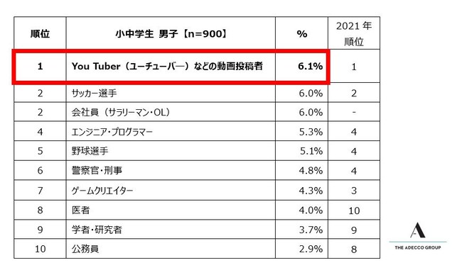 小中学生男子が選ぶ「将来就きたい仕事」のトップ10に、「YouTuber」、「ゲームクリエイター」、「エンジニア・プログラマー」という、デジタルテクノロジーと親和性の高い職業が、3年連続で3つ同時にランクイン。