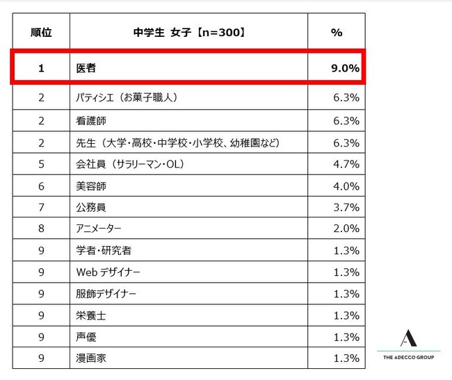 ― 中学生女子が選ぶ将来就きたい仕事の1位に初めて「医者」が選ばれる ―