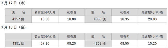 株式会社フジドリームエアラインズ(略称:FDA、本社:静岡県静岡市、代表取締役社長:楠瀬 俊一)は、新型コロナウイルスの影響により、「名古屋(小牧)=花巻」線の一部の便を減便しておりましたが、昨日発生した福島県沖での地震による交通アクセスの状況を踏まえ、下記のとおり、臨時便の運航を決定いたしました。
