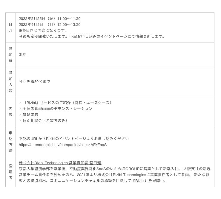 株式会社Bizibl Technologies(本社:大阪市北区、代表取締役:花谷燿平、以下当社)は、開発・提供するセミナー・イベントのオンライン開催SaaS『Bizibl(ビジブル)』のデモンストレーションをご紹介する「Bizibl徹底解説セミナー」を、2022年3月25日(金)、4月4日(月)に開催いたします。