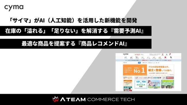 株式会社エイチームのグループ会社である株式会社エイチームコマーステック(本社:愛知県名古屋市、代表取締役:望月一宏)は、自転車専門通販サイト「cyma-サイマ-」においてAI(人工知能)を活用した新機能として、在庫の「溢れる」「足りない」を解消する『需要予測AI』、最適な商品を提案する『商品レコメンドAI』を開発しました。