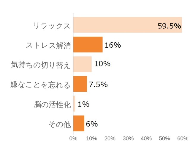 浴槽に浸かってお風呂の浮力効果や静水圧効果、温熱効果などでリラックスした上で、更に耳から心地よい音楽・大好きな音楽を聴くことでよりリラックス効果を求めていることが伺えます。その他、ストレス解消・気持ちの切り替え・嫌なことを忘れるは、それぞれ10%前後という結果となりました。