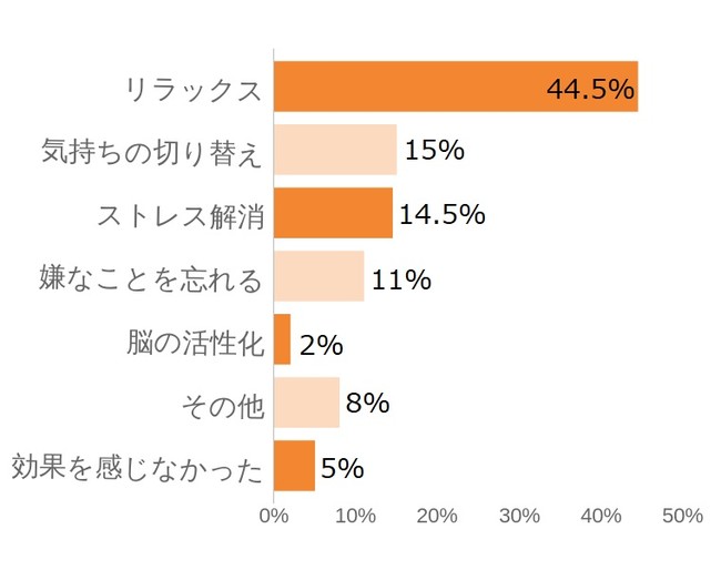 そして求めていることとしては2位が“ストレス解消”だったものの、実際に感じた効果の第2位としては“気持ちの切り替え”となりました。