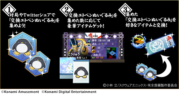 集めた「交換エトペンぬいぐるみ」の数に応じて、牌「エトペンと嶺上開花」などのアイテムをゲットできます。