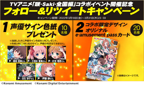 また、麻雀格闘倶楽部Sp公式Twitterにてフォロー&リツイートキャンペーンを開催します。TVアニメ『咲-Saki-全国編』で声を担当する声優5名のサイン色紙や、限定デザインのオリジナルe-amusement passカードをプレゼントします。