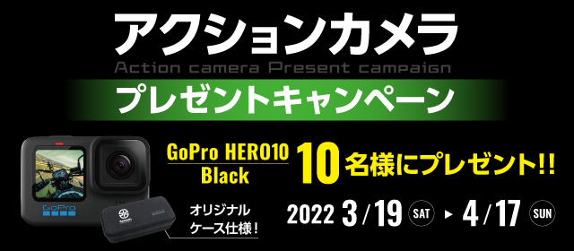 期間中、キャンペーンサイト内エントリーフォームよりご応募いただいた方の中から抽選で10名様に「アクションカメラ(Gopro HERO10 Black)」をプレゼントいたします。