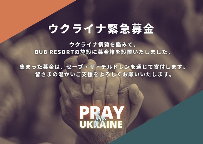 株式会社BUB(東京都品川区、代表取締役 一戸 悠人)が運営するBUB RESORT Chosei Village(千葉県長生郡)では、ウクライナへの人道危機支援として、泊まれるテーマパーク「BUB RESORT」の売上の一部をセーブ・ザ・チルドレンのウクライナならびに周辺国における「ウクライナ危機 緊急子ども支援」に寄付し、BUB RESORT店舗で「ウクライナ緊急募金」活動を実施いたします。