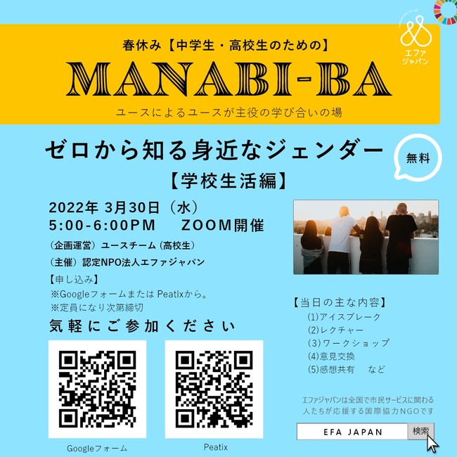 高校生ボランティアが企画・運営するオンライン勉強会で全国の中学生・高校生と一緒に学びませんか?国際協力NGOエファジャパン(認定NPO)のユースボランティアチームは、2022年3月30日(水)5:00PM~6:00PMに「ユースのMANABI-BA」を開催します。自分たちに身近な学校生活から、ジェンダーについて知り、考えてみようというイベントです。知識ゼロから、一緒に学び、考えよう!