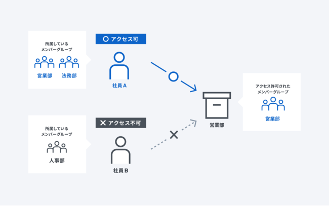 部署やプロジェクトなど任意の単位でユーザーを「メンバーグループ」としてグルーピングするとともに、同じく書類を取り扱う部署や書類の種別など任意の単位で「キャビネット」としてグルーピングする機能です。メンバーグループとキャビネットを紐づけることで、ユーザーの所属や書類の種別に応じた適切なアクセスコントロールを実現します。例えば、営業部キャビネットに対して、営業部・法務部のみ閲覧できる設定が可能になります。