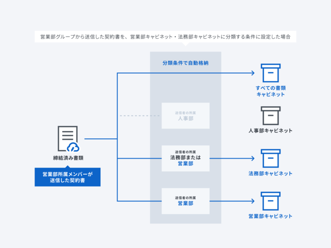 事前に設定した条件に基づいて書類が自動で分類される機能です。クラウドサイン上でグループ設定されている部署やプロジェクトなどに対して、格納したいキャビネットが決まっている場合に、そのルールを設定しておくと、クラウドサインで契約締結が完了した際に自動で指定のキャビネットに格納されます。