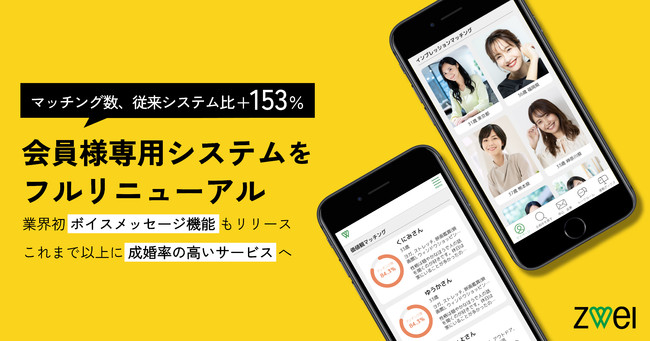業界最多“全国50店舗”の結婚相談所を運営する株式会社ZWEI(代表取締役:中本 哲宏)は、会員様向けシステム及び基幹システムのフルリニューアルを実施いたしました。リニューアルによる会員活動の活性化から、マッチング数が従来システム比+153%に増加。結婚相談所業界では初となる『ボイスメッセージ』機能もリリースし、現在提供している価値観マッチングのサービスを強化しました。今後も新機能の追加やAI導入など“ITシステム面”での強化を図り、ツヴァイが長年大切にしてきた“ヒューマンサポート”と融合させることで、より成婚率の高いサービスを目指してまいります。