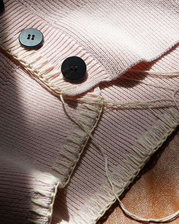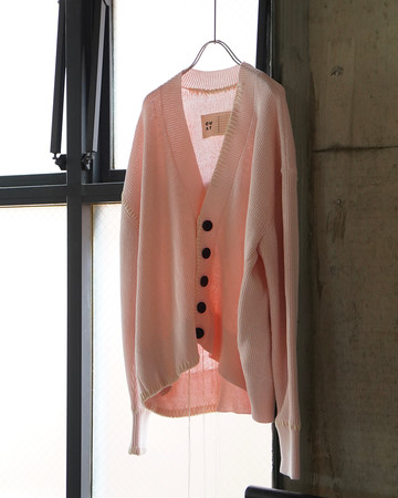 今回は、特殊なミシンで大ぶりなブランケットステッチを施した「OFFICE CARDIGAN」の通常展開のないライトピンクで別注。ドライタッチなコトン素材を贅沢に使用し、たっぷりとしたシルエットや大きめなフロントボタンが特徴のV ネックカーディガン。