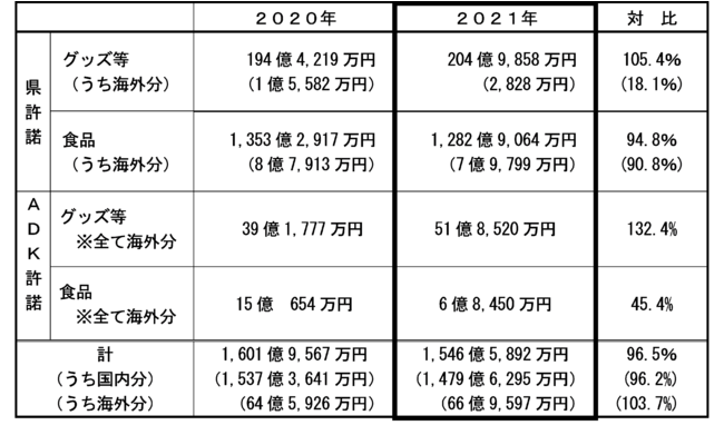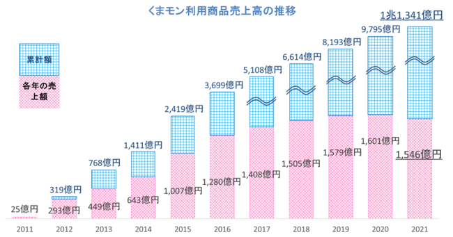 民間企業・団体によるくまモンを利用した商品等の売上高について、2011年の調査開始からの売上高累計は、1兆1,341億円となり、目標の1兆円を超えました。なお、2021年の売上高は、1,546億5,892万円であり、長引く新型コロナウイルス感染症拡大の影響等で、前年から55億3,675万円減少し、調査開始以来、初めて減少しました。