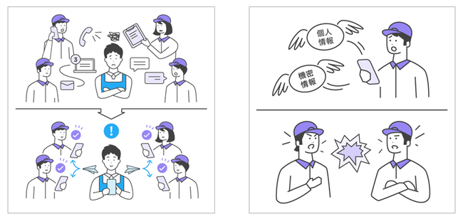 ここ数年、社員間でのコミュニケーションツールやグループウェアの普及が進んでいます。一方で、社員とパート/アルバイト間の連絡手段は未整備で、未だ紙媒体や無料チャットツールが使用されています。紙媒体を使用する場合は連絡業務の負荷が重く、無料チャットツールの使用は誤送信や誤招待による情報漏洩や従業員間トラブルなどのシャドーITと呼ばれる問題に発展するリスクがあります。