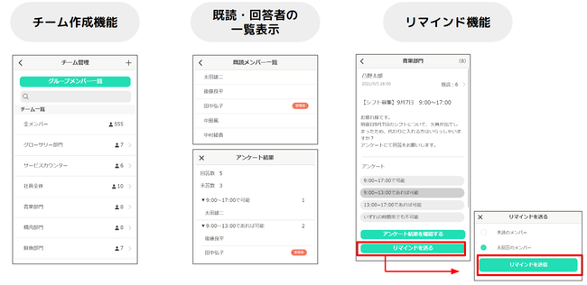 「コーポレート」「グループ」「チーム」「個人」の4階層を設定できるため、送信者は内容や受信者に合わせて簡単に連絡を出し分けることができます。また、スマホアプリ上からメッセージ既読者やアンケート回答者を一覧で閲覧することも可能。2タップの操作でリマインドを送ることもできます。