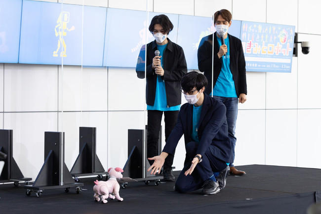 その後、ふくらPがペット型ロボットのaiboから公式アンバサダー任命証を受け取りました。メンバーは、このaiboがいちごミルクエディションであることにちなんで、1539(いちごミルク)年生まれの武将、長宗我部元親から「モトチカ」と命名。ふくらPが名前を呼ぶと、aiboが足元まで走って近づき、くわえていた任命証を差し出しました。