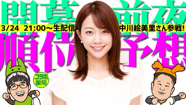 いよいよプロ野球の2022年シーズンが開幕します。その前夜、3月24日(木)に特別ゲストに元チーム・ヴィーナスで現在はフリーアナウンサーとして活躍する中川絵美里さんを迎え、午後9時からライブ配信を行います。チャンネルMCの加藤&水井デスクの計3人で、忖度抜きの順位予想を敢行します。