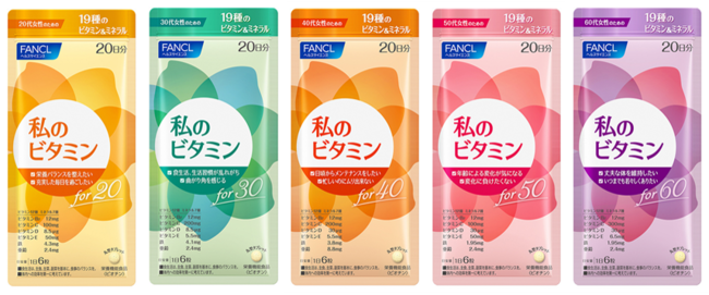株式会社ファンケルは、4月から全国のドラッグストアを中心に、「私のビタミン」シリーズ(20日分:1,080円<税込>)を新たに発売します。発売するのは、「私のビタミン for 20」から「私のビタミン for 60」までの計5製品です。各年代それぞれの女性に必要な基本栄養素を、これ一つで補えます。毎日の食事にプラスして、手軽に栄養素を摂りたい女性にお勧めです。