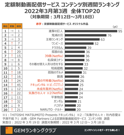 エンタテイメント業界に向けたデータ×デジタルマーケティングサービスを提供するGEM Partners株式会社(ジェムパートナーズ、所在地:東京都港区、代表取締役:梅津文)は3月25日(金)、エンタメコンテンツランキングやデータ情報を発信する「GEMランキングクラブ」プロジェクトにて作成した2022年3月第3週の「定額制動画配信サービス コンテンツ別週間ランキングTOP20(実査日:2022年3月19日、調査対象期間:3月12日~3月18日)」を発表します。