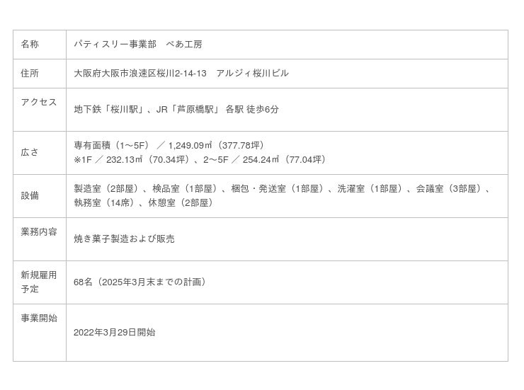 ■概要:パティスリー事業部「ぺあ工房」を浪速区桜川に拡張移転。障害者を約70名新たに採用予定