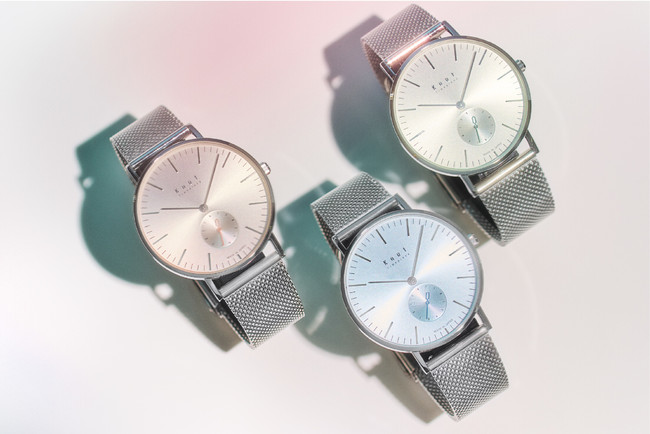 遠くの山並みが、薄雲がかかったように霞がかかって見える。そんなうららかな春の情景を表す季語「春霞(はるかすみ)」をテーマに、Knotの定番人気モデル「スモールセコンド(CS-36 https://knot-designs.com/c/collection/watch/smallsecond)」をベースにした3つのカラーが登場します。