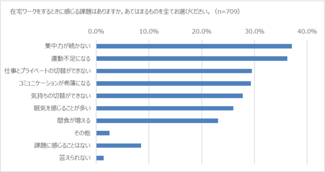 ・在宅ワーク中の課題は「集中力が続かない」が最も多く37.1%で、「運動不足になる」が2番目に多い。