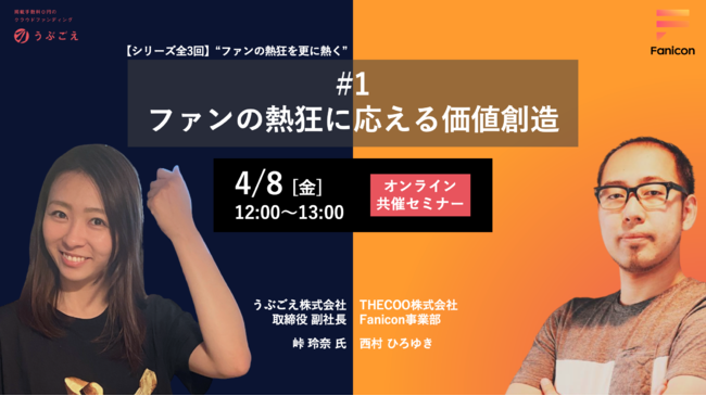会員制ファンコミュニティプラットフォーム「Fanicon」を運営するTHECOO株式会社(本社:東京都渋谷区、代表取締役CEO:平良真人、証券コード:4255)は、クラウドファンディングプラットフォーム「うぶごえ」を運営するうぶごえ株式会社(本社:東京都渋谷区、代表:岡田一男)と、共催セミナー(全3回)を開催いたします。