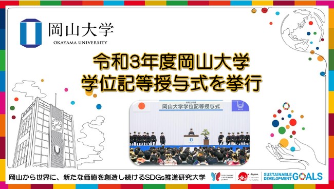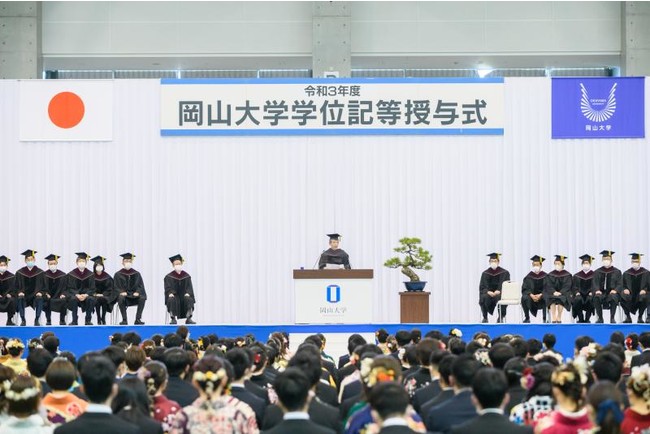 国立大学法人岡山大学(本部:岡山市北区、学長:槇野博史)は2022年3月25日、令和3年度学位記等授与式を岡山県総合グラウンド体育館(ジップアリーナ岡山)で行い、学部生・大学院生ら計3,162人の門出を祝福しました。