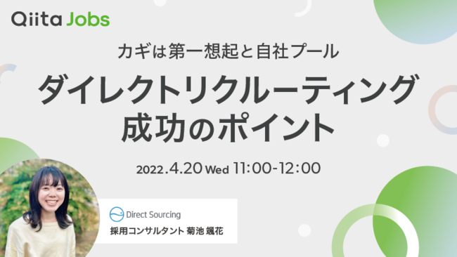株式会社エイチームのグループ会社であるQiita株式会社(本社:名古屋市中村区、代表取締役社長:柴田健介)は、無料オンラインセミナー「カギは第一想起と自社プール ダイレクトリクルーティング成功のポイント」を2022年4月20日(水)に開催します。