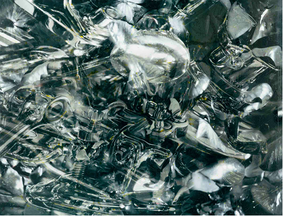 牧田は一貫して機械や金属類、プラスティックなどをモチーフに描いてきました。しばしば大画面に描かれるそれらの人工物は、複雑に重なり絡み合ったり、流線形を描くなど、有機的なイメージをつくり出しています。モチーフを写した写真にデジタル加工を施したうえで、作家自身の身体性を移すように時間をかけて筆で描き上げる牧田の絵画は、あたかも人工物と自然物、デジタルとアナログ、二次元と三次元、偶然性と蓋然性といった対照的に思われる性質のあわいにあるようです。