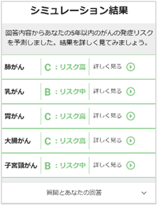 お客さまが、年齢、体重などの基本情報や喫煙歴といった生活習慣、健康診断結果などの情報を入力すると、5種のがん(肺がん、乳がん、胃がん、大腸がん、子宮頸がん)に関する発症リスクの傾向が、AからCの3段階*4で表示されます。あわせて、発症リスクのあるがんの情報やがん発症リスク低減のための生活習慣や予防に関する情報、がん検診などの健康サービスや保険情報などを提供します。