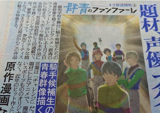 報知新聞社(代表取締役社長・依田裕彦)が発行する「スポーツ報知」では、4月2日から放送開始予定の新作テレビアニメ「群青のファンファーレ」の特集連載記事を3月30日(水)付紙面から3回連続で掲載します。スポーツ報知WEBサイト(https://hochi.news/)でもご覧いただけます。