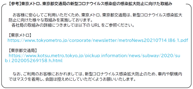 東京メトロと東京都交通局は、今後も沿線の観光施設や企業と連携し、便利な乗車券を中心としたお得な商品の開発、発売を通して東京の都市内観光を楽しんでいただく取組みを推進します。