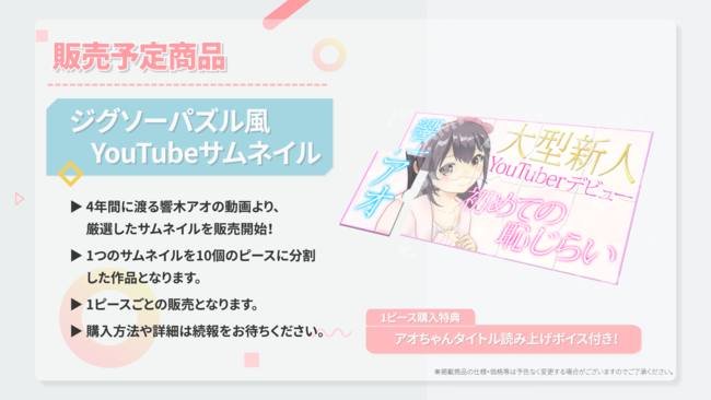 4年間に渡る響木アオの活動の軌跡である、YouTube動画より厳選した100個のサムネイルを販売致します。1つのサムネイルを10個のパズルピースに分割した作品で1ピースごとの販売となります。また、購入されたサムネイルの動画タイトルを響木アオが読み上げたボイスが特典となります。