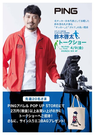期間中は2022年の春夏コレクション展開の他、4月9日(土)にはPINGアパレル ポップアップストアにて2万円(税抜)以上お買い上げの方に、PINGアパレルのアンバサダーに就任した元サッカー日本代表として活躍した鈴木啓太さんのトークショーへご招待いたします。さらに、サイン入りエコBAGのプレゼントもあります!