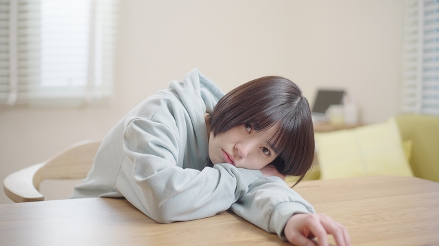 休日に家でゆっくりと過ごす女性(中井友望)。お腹が空いてきたけれど冷蔵庫やストック棚には何もない。だからといって、外に買いに行くのも面倒。