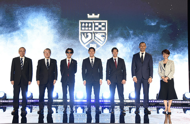 左から川原貴(UNIVAS副会長)、福原紀彦(UNIVA会長)、米岡聡選手(三井住友海上火災保険株式会社所属)、本多灯選手(日本大学)、大島健吾選手(名古屋学院大学)、スポーツ庁 室伏広治長官、有森裕子(UNIVAS副会長)