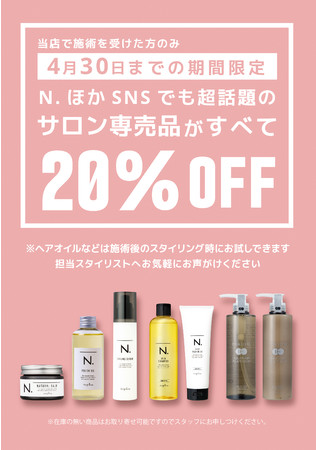 なお、4月30日までの期間限定でソーエン バイ ヘッドライト 姶良店を含むヘッドライトグループの美容室全店で、サロンをご利用された方にサロン専売のヘアケア商品がすべて20%OFFになるキャンペーンを実施中です。