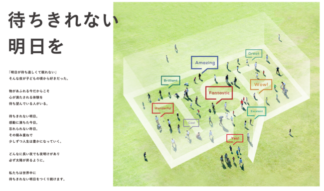 ミッション・ビジョンを起点に、私たちの提供価値を端的に表したものがスローガンです。当社が展開するイベントや空間を通じて、世界中の人々にワクワクするような「待ちきれない明日を」つくり続けることで、未来への希望を胸に抱きながら毎日を過ごして欲しいという願いをスローガン・ステートメントに込めました。