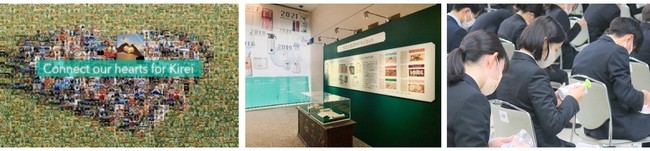 新入社員の写真を繋いだオープニング動画(左) 会場の隅には創業者・長瀬富郎の遺言状や貴重な資料を展示したミニミュージアムも(中)