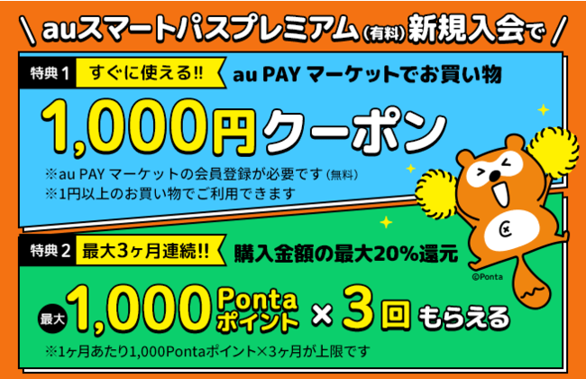 auスマートパスプレミアム新規入会者向け特典の1つ目は、総合ショッピングサイト「au PAY マーケット」で利用いただける「1円以上で使える1,000円オフクーポン」を提供します。2つ目は、特典1つ目の「1円以上で使える1,000円オフクーポン」を取得されたお客さまに、au PAY マーケットの購入額×最大20%のPontaポイントを還元。3か月連続でお買い物をいただくと、3か月連続で合計金額の最大20%をPontaポイント加算いたします。