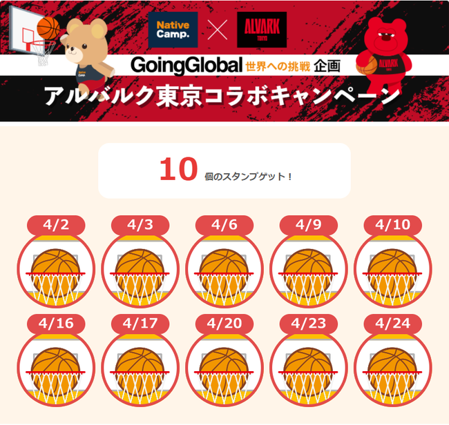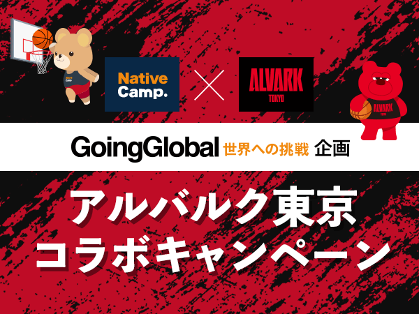 ネイティブスピーカーと回数無制限のオンライン英会話サービス「ネイティブキャンプ英会話」を展開する株式会社ネイティブキャンプ(東京都渋谷区 代表取締役:谷川国洋)は、男子プロバスケットボールBリーグ「アルバルク東京」とのコラボ企画「Going Global ~世界への挑戦~ 企画 アルバルク東京コラボキャンペーン」を開催いたします。