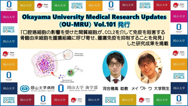 本号では、学術研究院医歯薬学域(歯)口腔病理学分野の河合穂高助教とミャンマー人留学生のメイ ワト ウ大学院生の共同研究グループらの、口腔癌細胞の影響を受けた間質細胞が、CCL2を介して免疫を阻害する骨髄由来細胞を腫瘍組織に呼び寄せ、腫瘍免疫を抑制することを発見した研究成果について紹介しています。