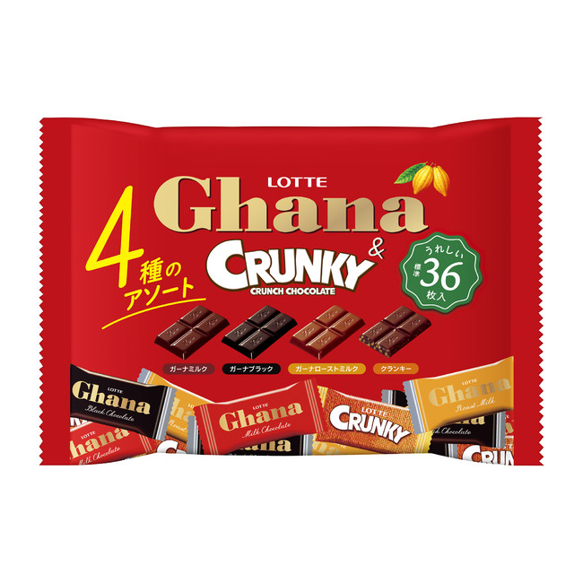 とろける口どけのガーナとサクサクのクランキーが一度に楽しめる、4種アソートのシェアパック。