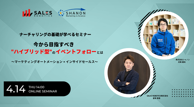 株式会社シャノン(本社:東京都港区)は、4月14日(木)に「イベントフォロー設計術」と「ハイブリッド型で効率化するナーチャリング手法」についてご紹介するウェビナーを、SALES ROBOTICS株式会社と共同で開催いたします。