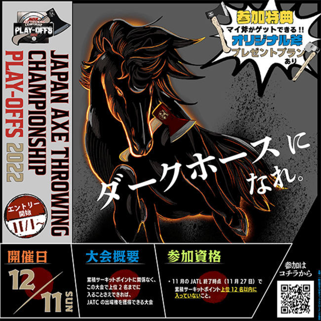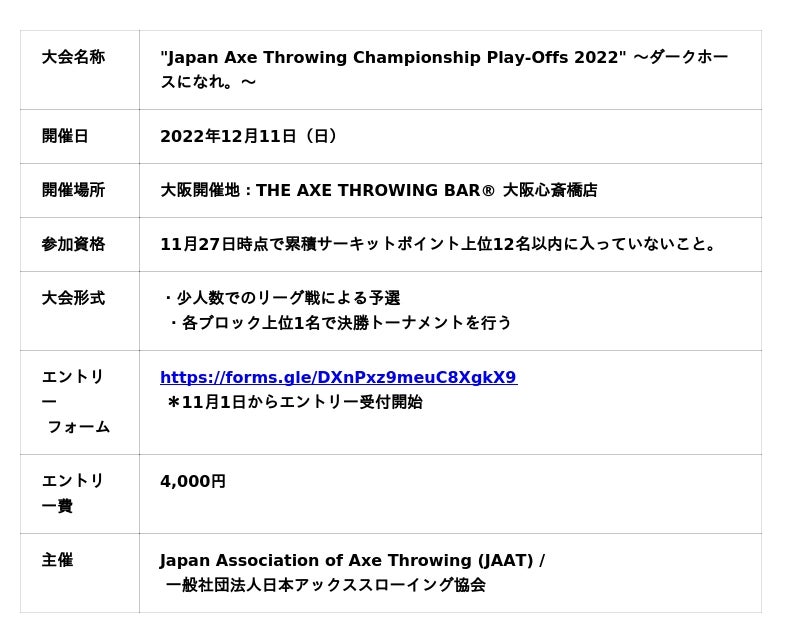 「"Japan Axe Throwing Championship Play-Offs 2022"~ダークホースになれ。~(以下、「当大会」)」とは、東京と大阪で12月11日に開催されるAXE THROWING(斧投げ)の大会となります。当大会に参加するためには、11月27日時点で累積サーキットポイント上位12名以内に入っていないことが条件となります。そして、当大会で上位2名に入ることで、「斧投げ日本一決定戦。"Japan Axe Throwing Championship 2022 @TOKYO"」への出場権を獲得することが可能となります。その他にも、参加者限定の特典として協会オリジナル斧とAXE THROWINGの利用料がセットになったお得なパッケージプランの購入ができます。