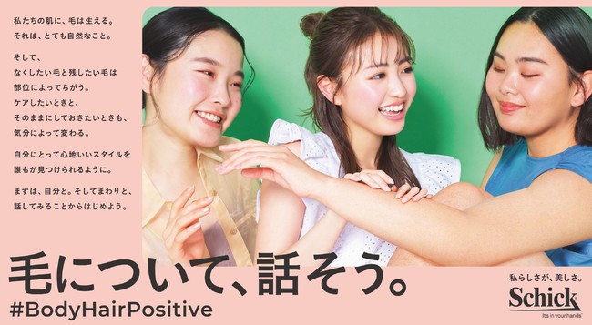 シックでは2021年から「#BodyHairPositive」というプロジェクトを開始。ボディヘアに関する自分の考えやコンプレックスについて身近な人とポジティブに話し合える社会の実現や、ボディヘアに対する多様性の創出を目指しています。国内No.1カミソリブランド(※1)であるSchickは、気分やケアしたい部位によって剃る剃らないという選択肢があっていい、そしてその選択肢は他人に促され決めるものではないと考えます。自分らしくあること、それが美しさであるということを含めた多様性を推進します。